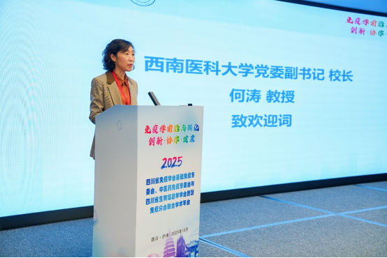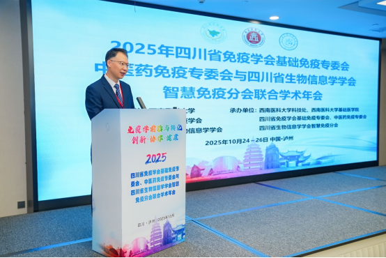 10月25日,由西南医科大学、四川省免疫学会、四川省生物信息学学会共同主办的“2025年四川省免疫学会基础免疫专委会、中医药免疫专委会与四川省生物信息学学会智慧免疫分会联合学术年会”在西南医科大学学术交流中心(泸州酒城豪生酒店)成功举办。会议开幕式由西南医科大学科技处处长吴建明主持,西南医科大学党委副书记、校长何涛出席并致辞。约200位来自省内外高等院校、科研院所及医疗机构的免疫学、生物信息学及相关领域的专家学者与技术骨干参会。